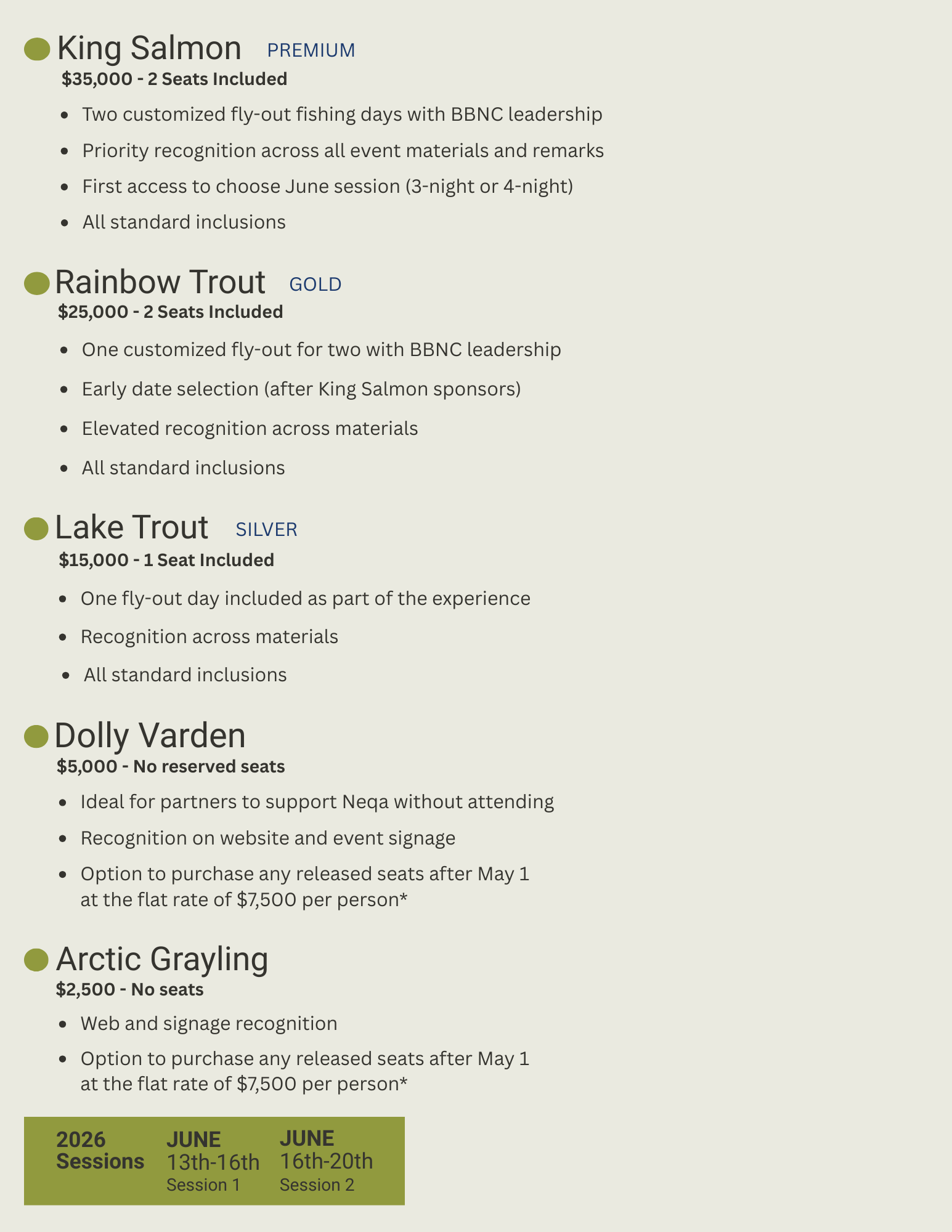 *The all-in seat cost for Neqa is $7,500 which includes all on-the-ground experiences at Kulik Lodge and airfare to and from Anchorage. Seats are included in the King Salmon, Rainbow Trout, and Lake Trout sponsorship packages. After May 1st, any remaining seats for Kulik Lodge will be sold at that $7,500 value, regardless of sponsorship level. Learn more here.